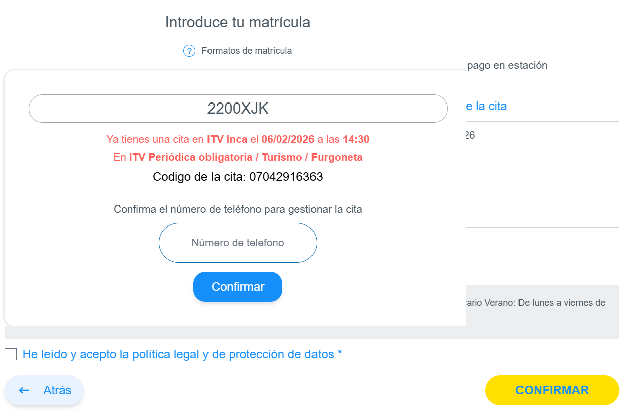 Desde la web oficial, introduce tu matrícula como si fueras a pedir una cita nueva. El sistema verá que tienes una cita, te saltará ese mensaje, y tendrás que confirmar el resto de datos.